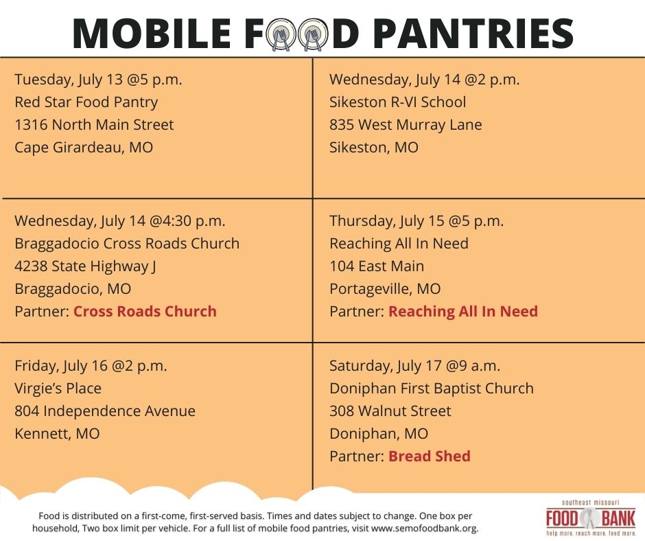 Semo Food Bank On Twitter Here Are This Weeks Mobile Food Pantry Distributions As Always We Thank All Of Our Donors Volunteers And Partners Crossroads Church Rain Reaching All In Need And
